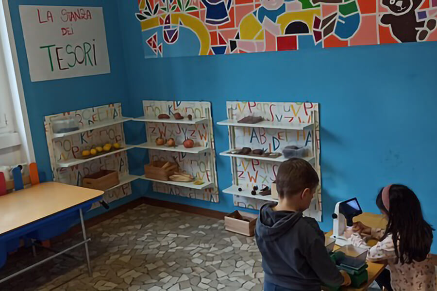 La stanza dei tesori ha lo scopo di fornire ai bambini oggetti di uso comune in grado di stimolare il tatto, l’olfatto, l’udito, la vista e la motricità lasciando i bambini alla sperimentazione autonoma senza che l’adulto interferisca con consigli o suggerimenti.